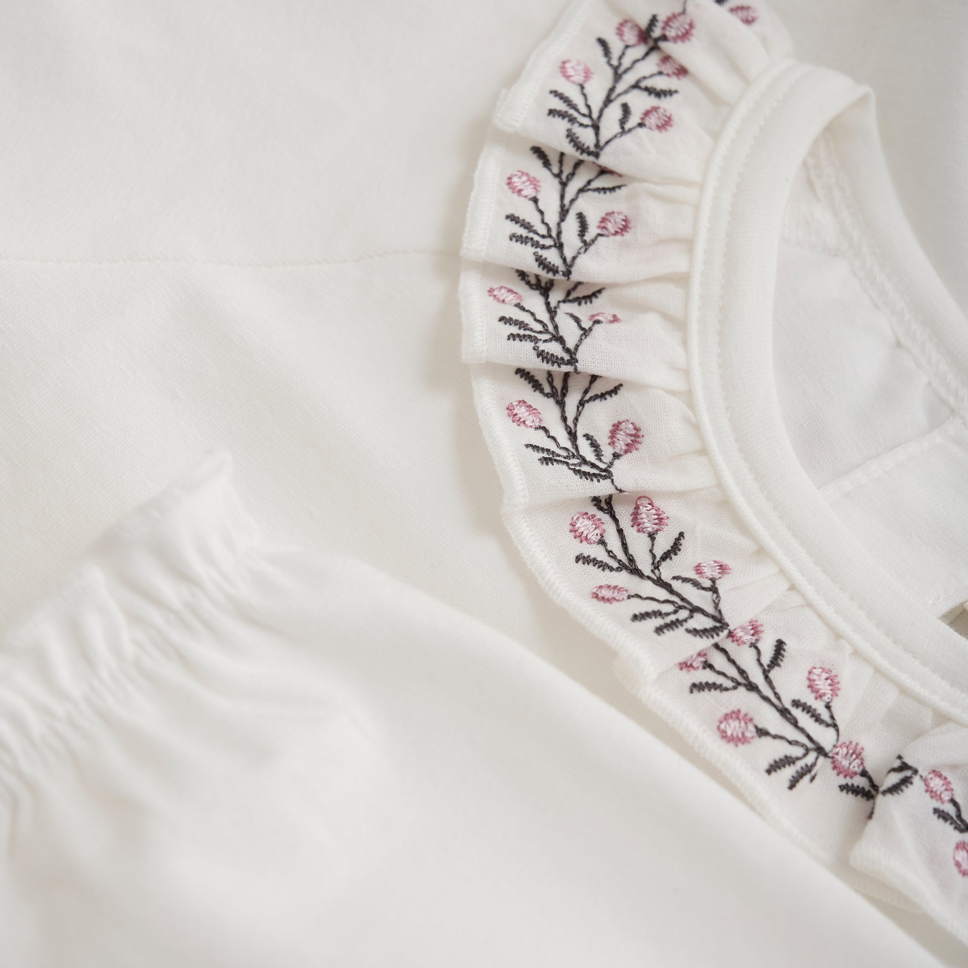 Designet har en elegant krave med fine flæser, som giver et klassisk og feminint udtryk. De lange ærmer afsluttes med elastik ved håndleddene, der skaber en flot flæseeffekt. Bodyen lukkes nemt med trykknapper mellem benene, så både på- og afklædning går hurtigt i hverdagen.