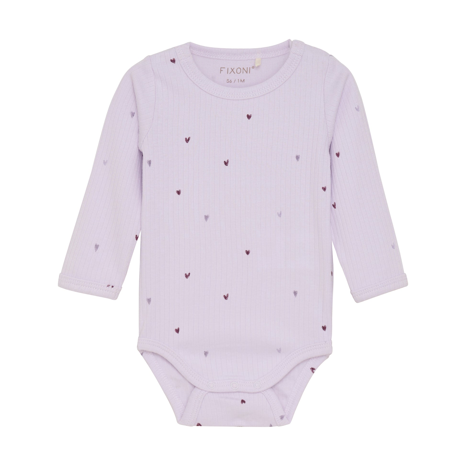 Sød body fra Fixoni med et fint all-over print. Bodyen er lavet i en blød ribkvalitet, som føles behagelig og komfortabel mod huden.