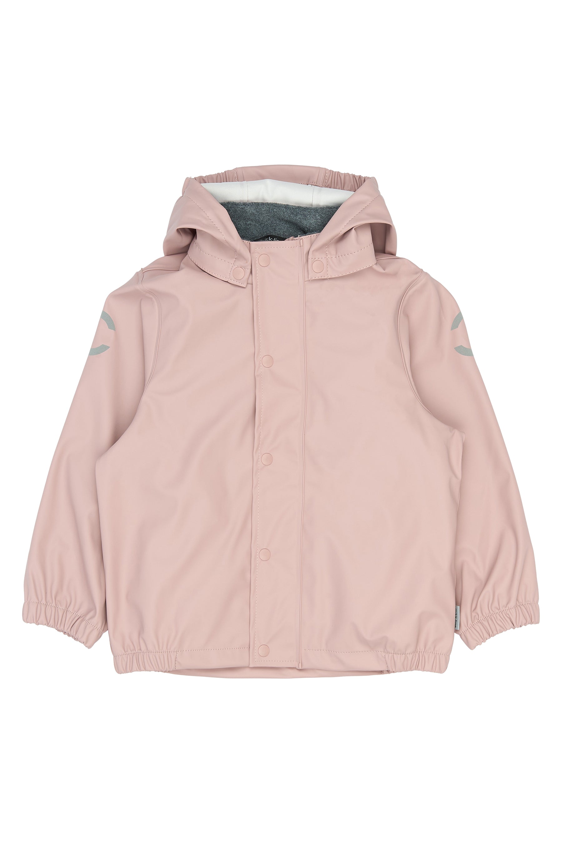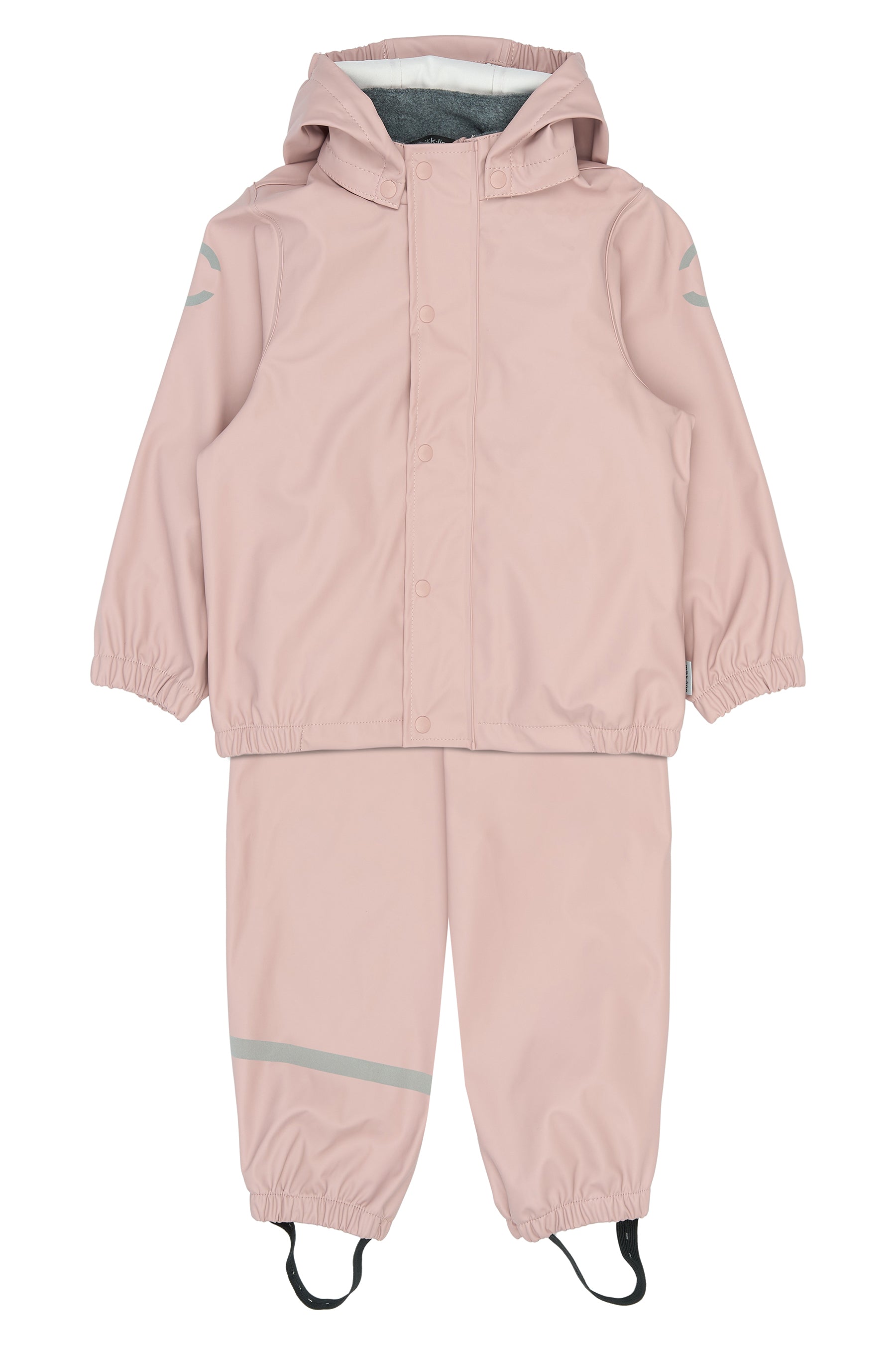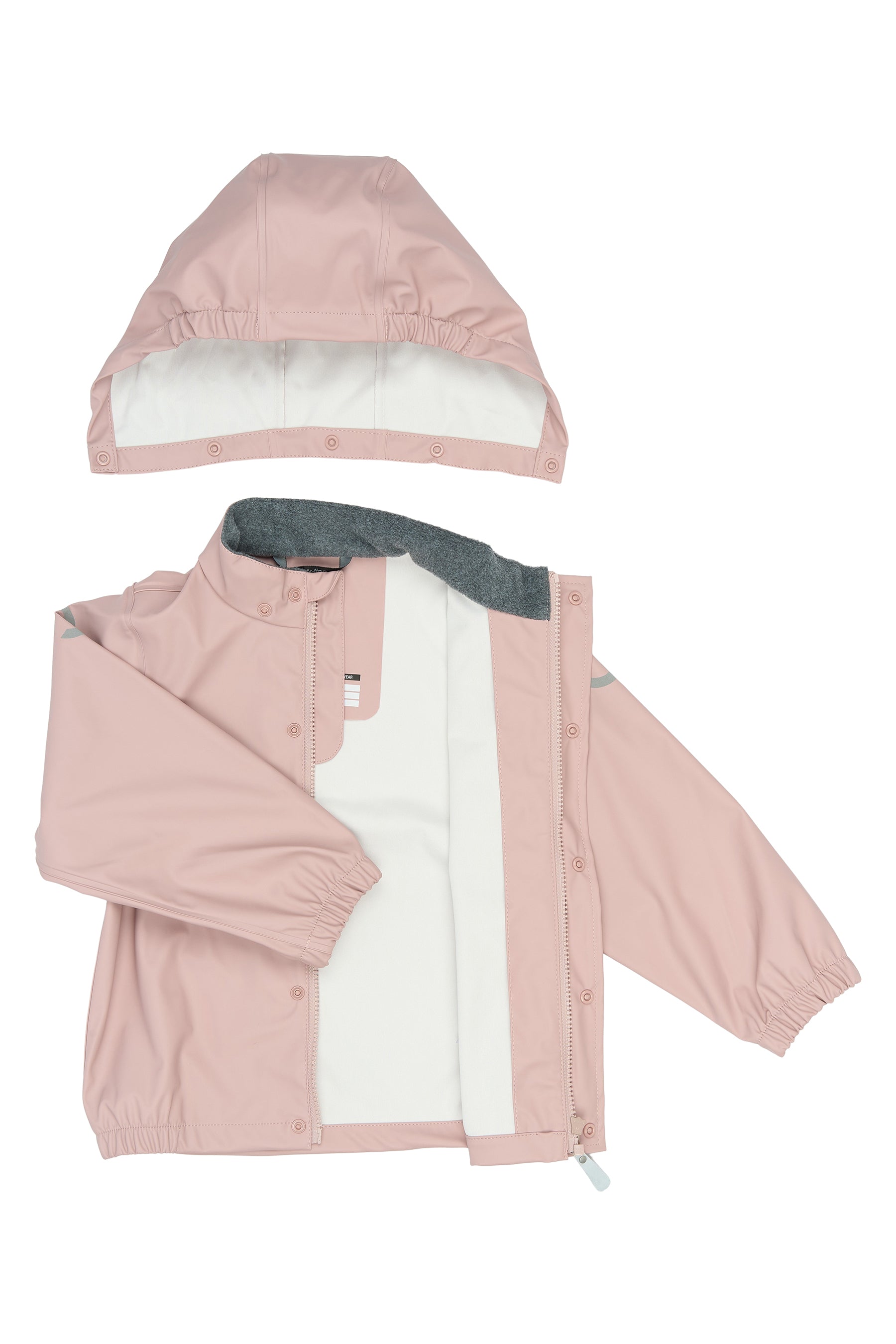 Regntøjet har svejsede sømme og et vandsøjletryk på 5.000 mm, som effektivt holder barnet tørt. Jakken er udstyret med aftagelig hætte, YKK-lynlås med hagebeskytter og fleeceforing ved halsen for ekstra komfort. Bukserne har justerbar elastik i taljen samt justerbare fodstropper, der holder buksebenene på plads og fødderne tørre.