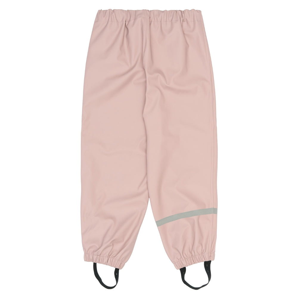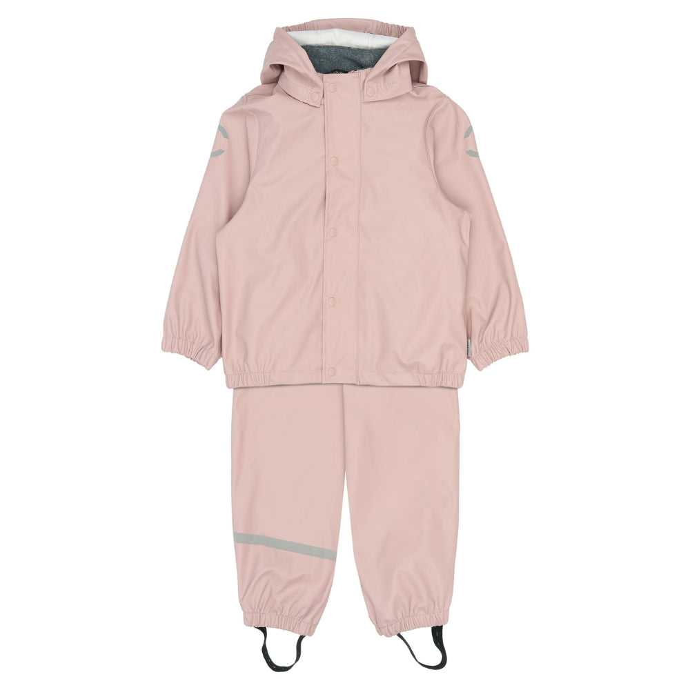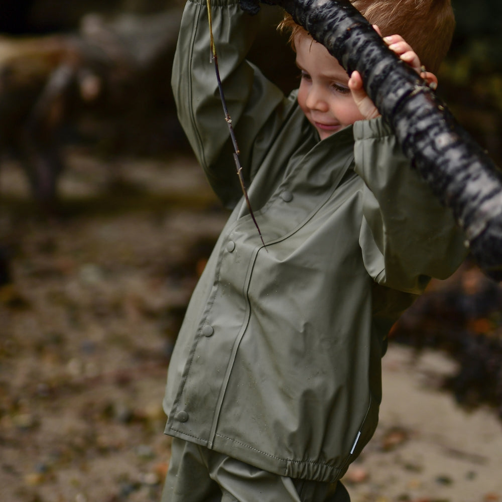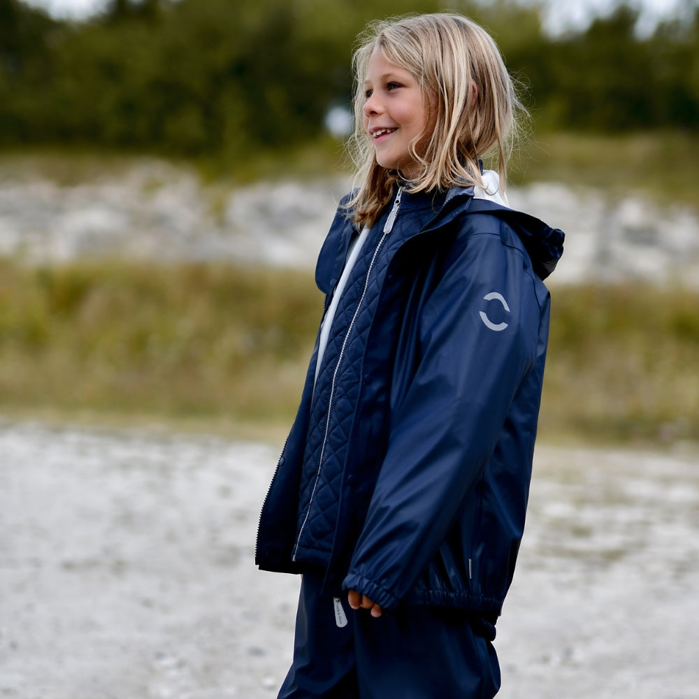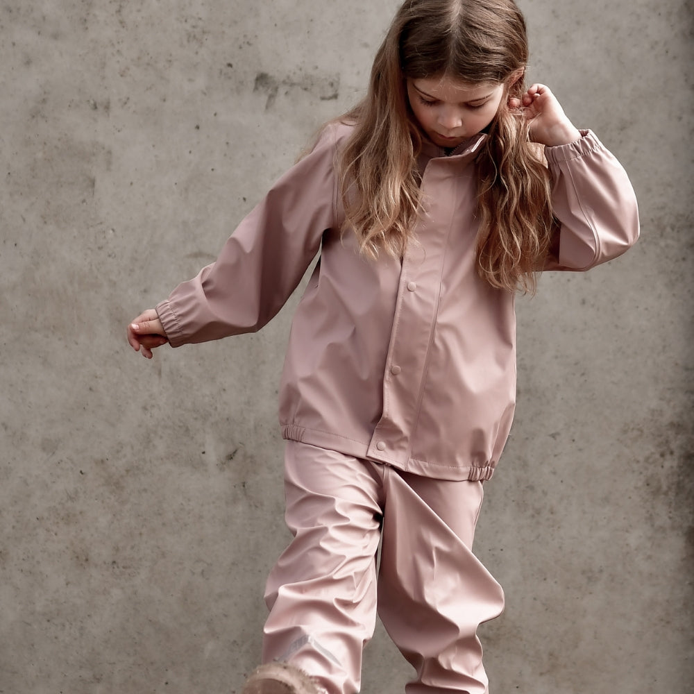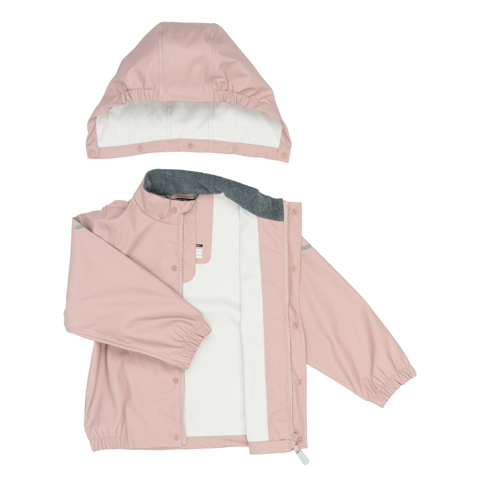 Regntøjet har svejsede sømme og et vandsøjletryk på 5.000 mm, som effektivt holder barnet tørt. Jakken er udstyret med aftagelig hætte, YKK-lynlås med hagebeskytter og fleeceforing ved halsen for ekstra komfort. Bukserne har justerbar elastik i taljen samt justerbare fodstropper, der holder buksebenene på plads og fødderne tørre.